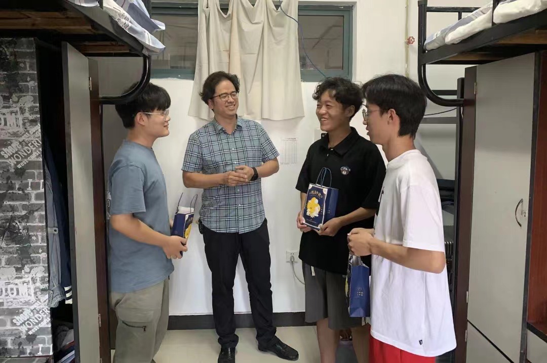 党委书记方跃平,院长史修永,副院长李广文、刘振,党委副书记刘宁,学工办主任李玉雪,新生辅导员张瑞亭、宋禹凝和新生班主任牛菡、姚佳慧等老师来到南湖校区学生宿舍看望本科新生,为同学们赠送中秋礼物,送上主播色情