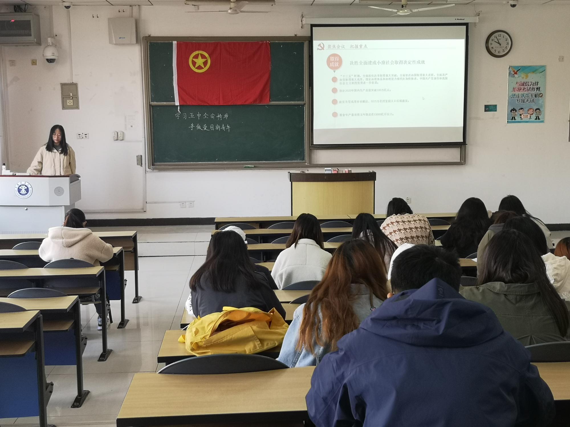 活动伊始,原媛同学为同学们简要介绍了中共十九届五中全会。五中全会系统归纳了我国决胜全面建成小康社会取得的十方面决定性成就,阐述了我国发展环境面临的深刻复杂变化,同时明确提出了我国到2035年要实现的九方面远景目标以及“十四五”时期经济社会发展的六方面主要目标,指明了实现奋斗目标的十二方面具体举措,为实现第二个百年奋斗目标和中华民族伟大复兴的中国梦提供了战略指引。接着,同学们一起观看了青年大学习的视频,本期青年大学习以“全面建成小康社会,一个也不能少”为主题,彰显着中国特色社会主义的崇高追求,体现了以习近平同志为核心的党中央的坚定意志。之后,王昕妍、常明慧和郑一鸣同学分别进行发言,表达了自己勇担使命、争做爱国新青年的决心。