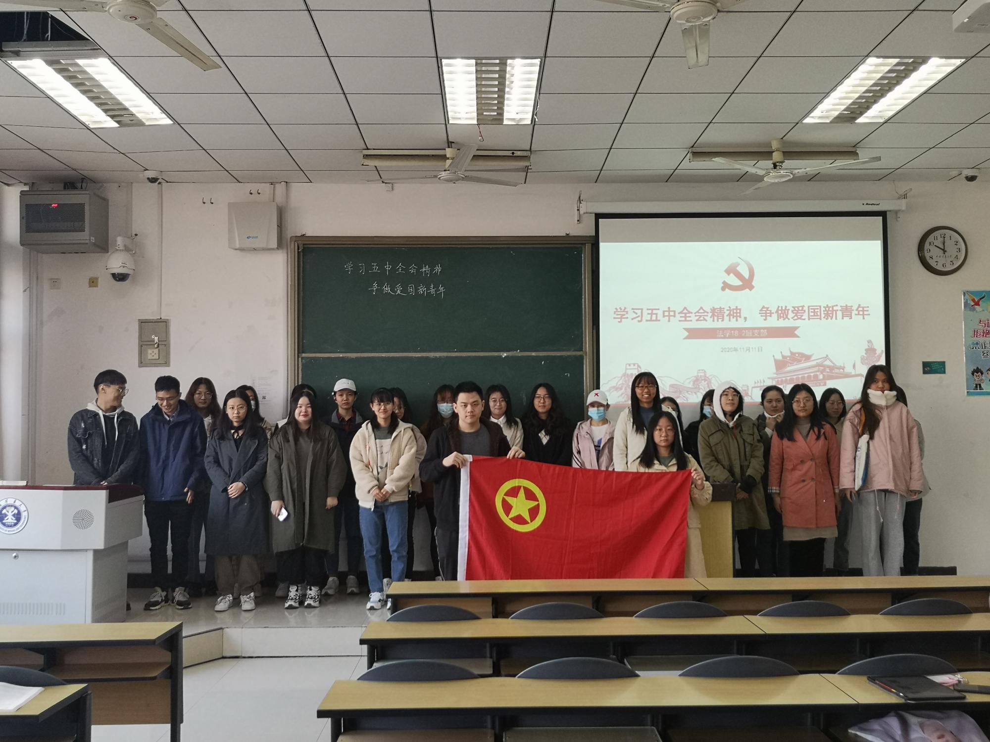 法学18-2班团支部于博二A101开展主题团日活动——学习五中全会精神,争做爱国新青年,本次团日活动由团支书原媛同学主持,团支部所有同学均积极参与。
