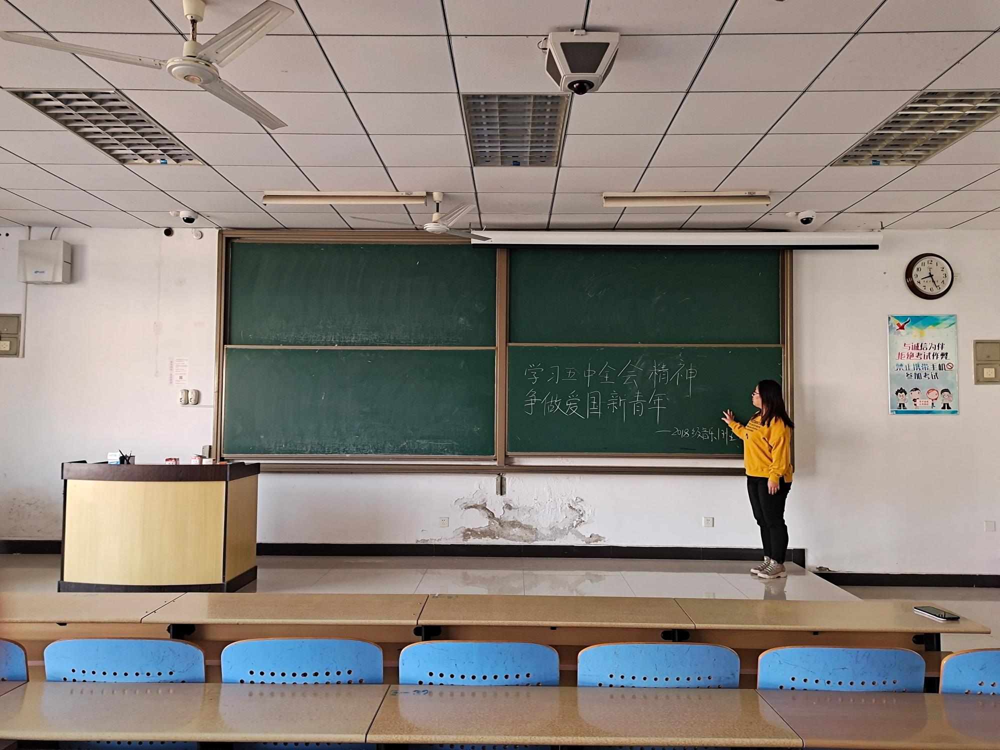 班会上,首先,团支书韦紫奡播放了PPT向同学们展示了五中全会相关资料,然后播放了两个关于新青年及爱国主题的视频,让同学们对五中全会有了具体化的印象。其次,围绕五中全会的内容同学们展开了讨论,并对其意义进行交流。最后,由团支书韦紫奡总结出同学们的观点,强调了作为当代新青年,我们要紧跟党的步伐,积极为社会做贡献。