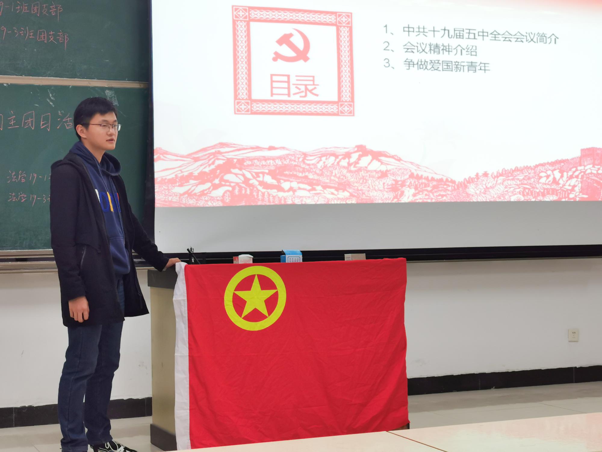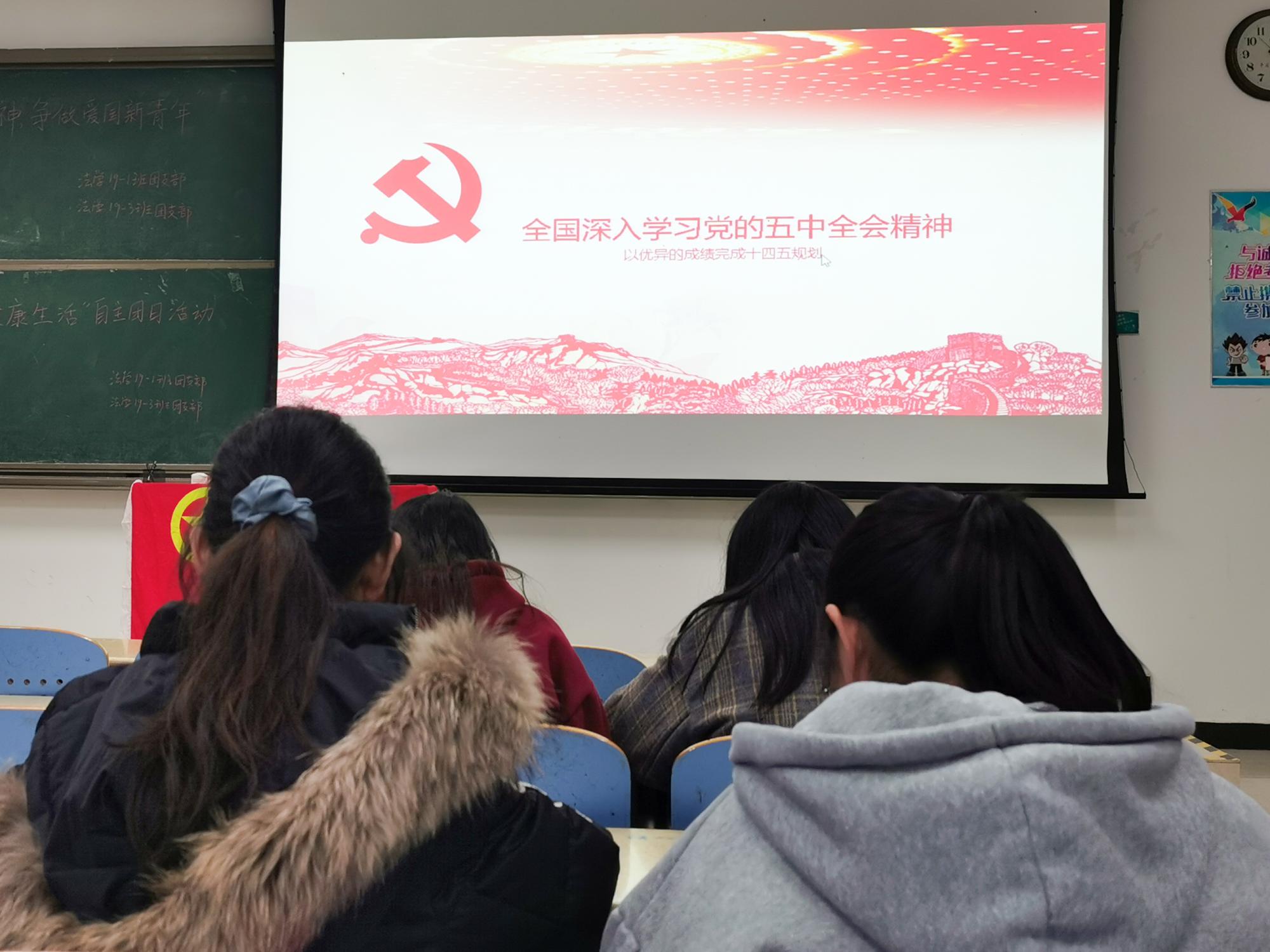 11月19日下午4时,法学19-1班团支部于博1C104,与法学19-3班团支部一同开展了以“全国深入学习党的五中全会精神”为主题的团日活动。中共十九届五中全会高度评价了决胜全面建成小康社会取得的决定性成就,提出到二〇三五年“基本实现社会主义现代化”的远景目标,以及“十四五”时期经济社会发展主要目标。本次活动的目的,在于让同学们学习领会五中全会精神,提升个人素质,从而为国家的发展贡献力量。