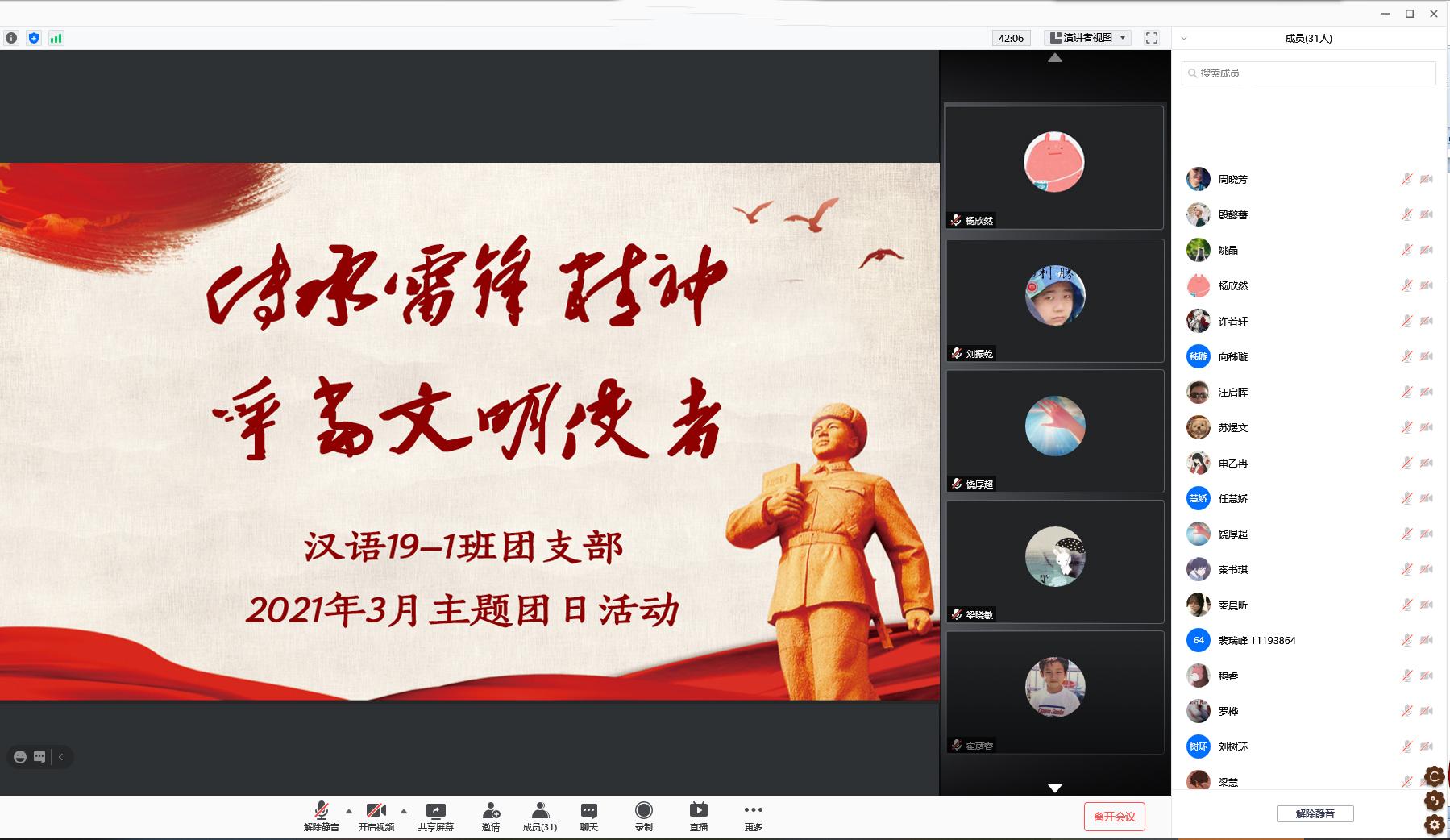 汉语言文学2019-1班团支部于线上开展“传承雷锋精神,争当文明使者”自主团日活动。本次活动由团支书刘振乾主持,团支部全体成员到场参加。